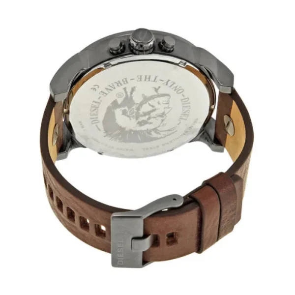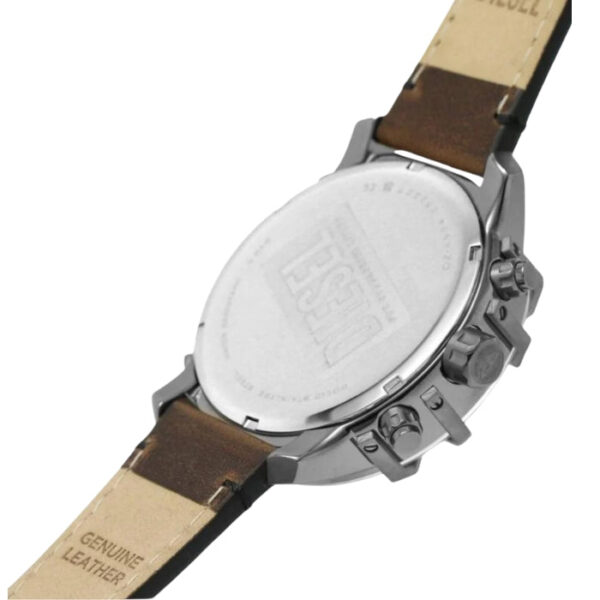 This watch is a bold and distinctive timepiece that combines military, denim, and rock and roll influences. With its oversized 57mm case and multi-layered chronograph display, it’s perfect for those who want to make a statement. The blue dial features four time zones, a date window, and a second hand. The brown leather band and stainless steel case add to the watch’s rugged and masculine appeal.