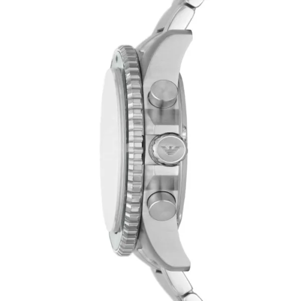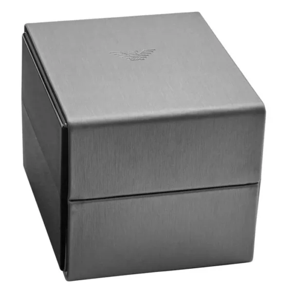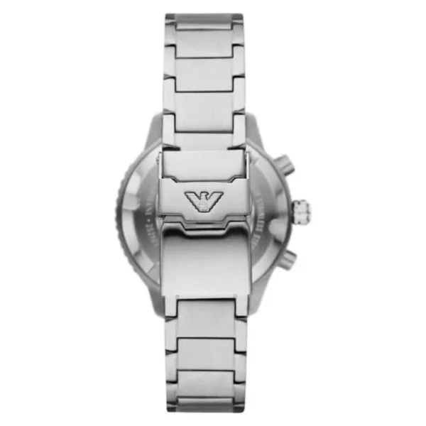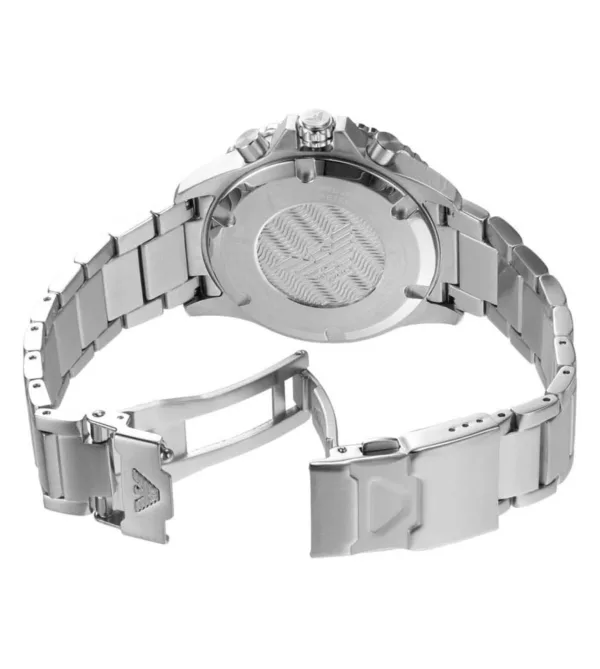 The Emporio Armani Chronograph Men’s Watch is a versatile and stylish watch that is perfect for both casual and formal occasions. The watch features a round case with a diameter of 43mm, making it a substantial presence on the wrist. The case is made from stainless steel and has a polished silver finish, giving it a sleek and contemporary look.