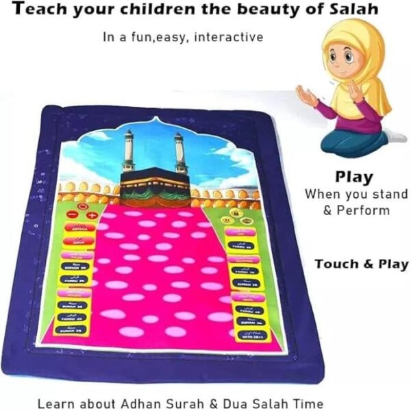 - Interactive Learning: The mat’s interactive features make it easy for kids to explore different aspects of Islamic prayer, from performing wudu to reciting Surah Al-Fatiha.